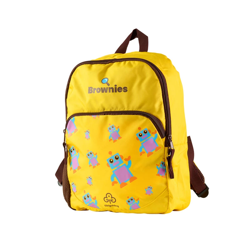 Our Brownies backpack is back and features our new robot character and iconic yellow and brown. It’s a great accessory for girls aged 7-10 with a mesh bottle holder, zip pocket and adjustable straps.