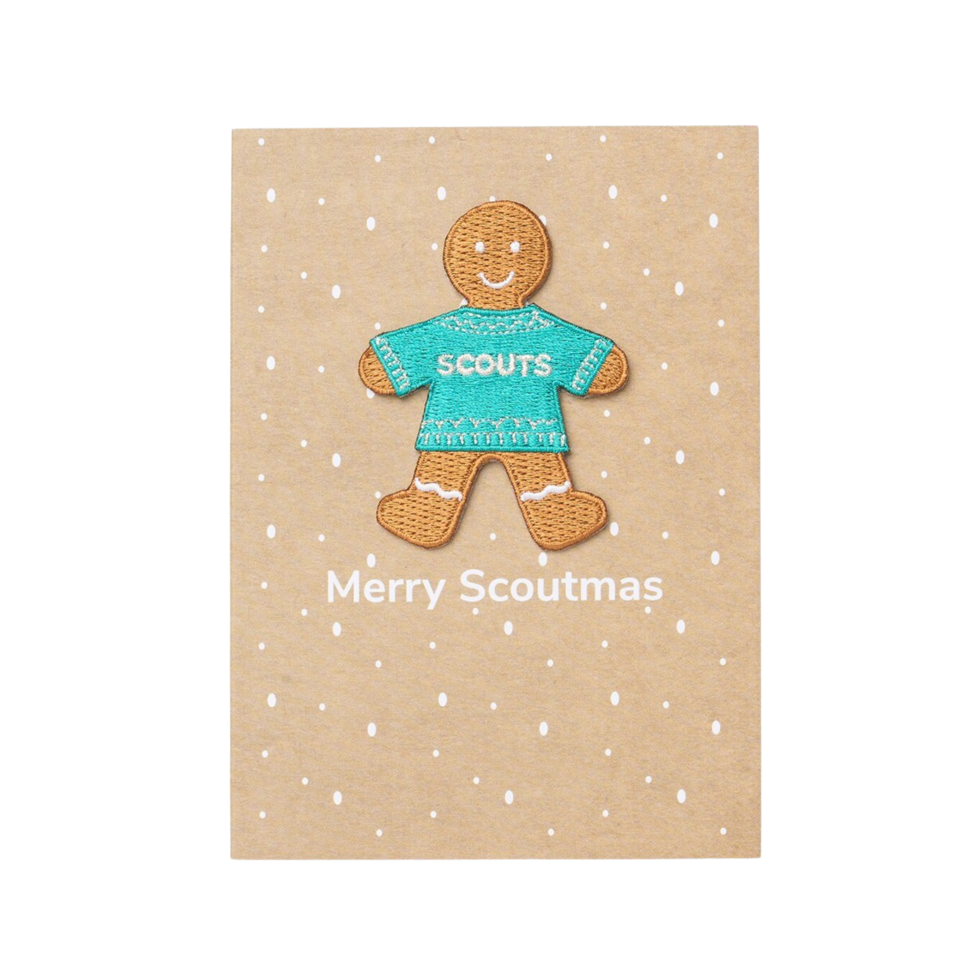 Send your Season’s Greetings with this Scouts Merry Scoutmas card featuring a detachable woven Christmas gingerbread badge and season's greetings message inside the card.